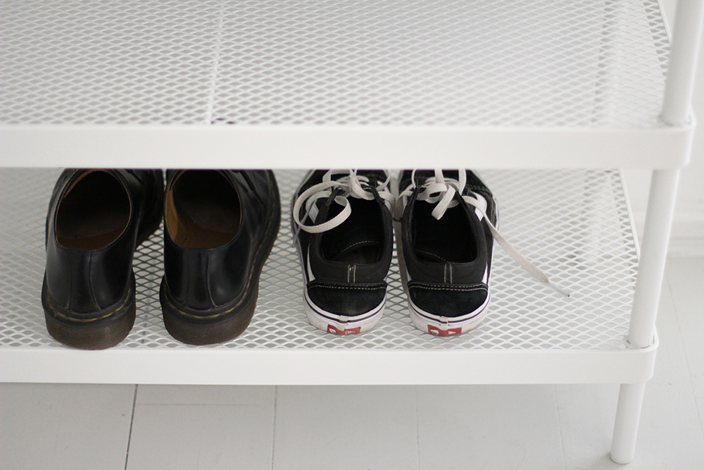 Täällä on aika kivan kokoinen eteinen, joten ajattelin että sinne nyt ainakin mahtuu hyvin säilytystilaa kengille ja takeille. Ikeaan oli vasta tullut uusia eteiskalusteita sopivasti, joten pääsin niitä sitten hyödyntämään. Kenkäkaappi tuli heti ulko-oven viereen, ja sinne saa ylimmälle hyllylle toki muutakin sälää piiloon katseilta. Toiselle puolelle kylppärin ja olohuoneen oviaukon väliin sijoitin metallisen naulakon, jossa on paikka muutamalle sen hetken käytetyimmälle takille ja kengille. Naulakkoon saa kätevästi myös kangaskassit, avaimet ja hatun!