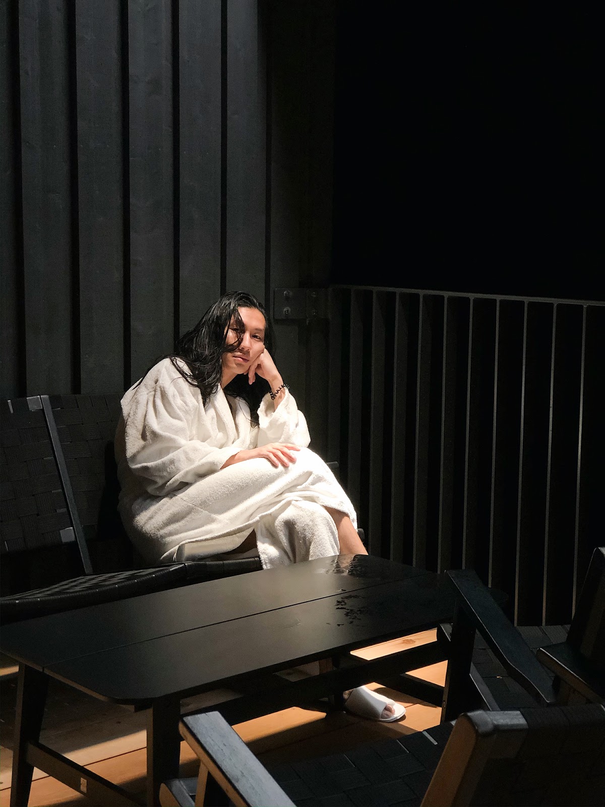 Meidän hotellivierailuun kuului huoneen ja aamiaisen lisäksi pari tuntia rantasaunalla paljussa nauttimista sekä illallinen hotellin omassa ravintolassa. Maleksimme tutkimassa paviljonkityyppisen hotellin erilaisia tiloja, atrium-pihoja, upeita arkkitehtoonisia yksityiskohtia ja nautiskelimme takkatulen ääressä illasta. Oli ihanaa vaihtaa kylpytakki päälle heti saapumisen jälkeen iltapäivästä ja pujahtaa rantaraunalle ennen illallista. Tyrskyävä meri ja viima eivät yhtään haitanneet uudella rantasaunalla, jossa takkatuli lämmitti tunnelman, juomat odottivat kylmässä coolerissa ja valmiiksi lämmitetty palju höyrysi pimenevässä illassa.